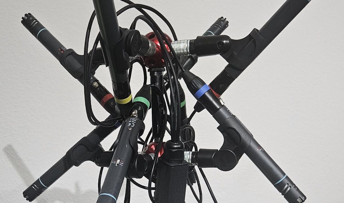 We built a double IRT cross using regular SDC microphones with a cardioid pattern. The distance between each capsule should be 25 cm, and the angle between them should be 90°.