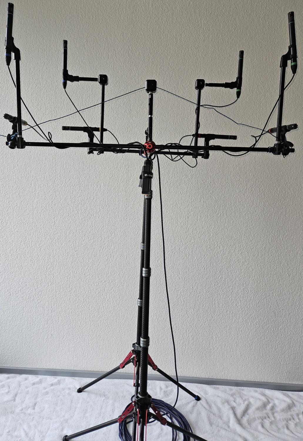 If you want the super-cardioid microphones more than 40 cm above the horizontal layer, the laws of leverage will kick in, so you will need sturdier connections to the stand. The chosen solution has its limitations but is a good compromise between sturdiness and weight.