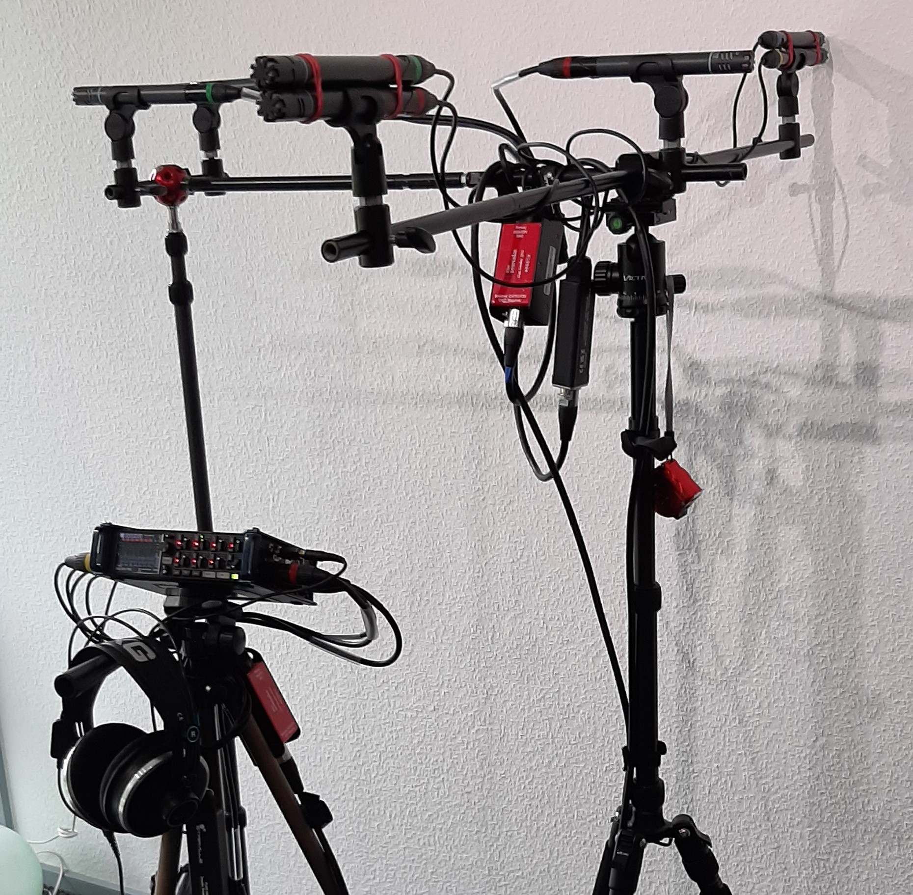 The microphones under the omnis are hyper-cardioid, which are necessary for an OCT setup. The microphone in the middle is a cardioid microphone, and its capsule is positioned eight centimeters in front of the axis between the hypercardioids.